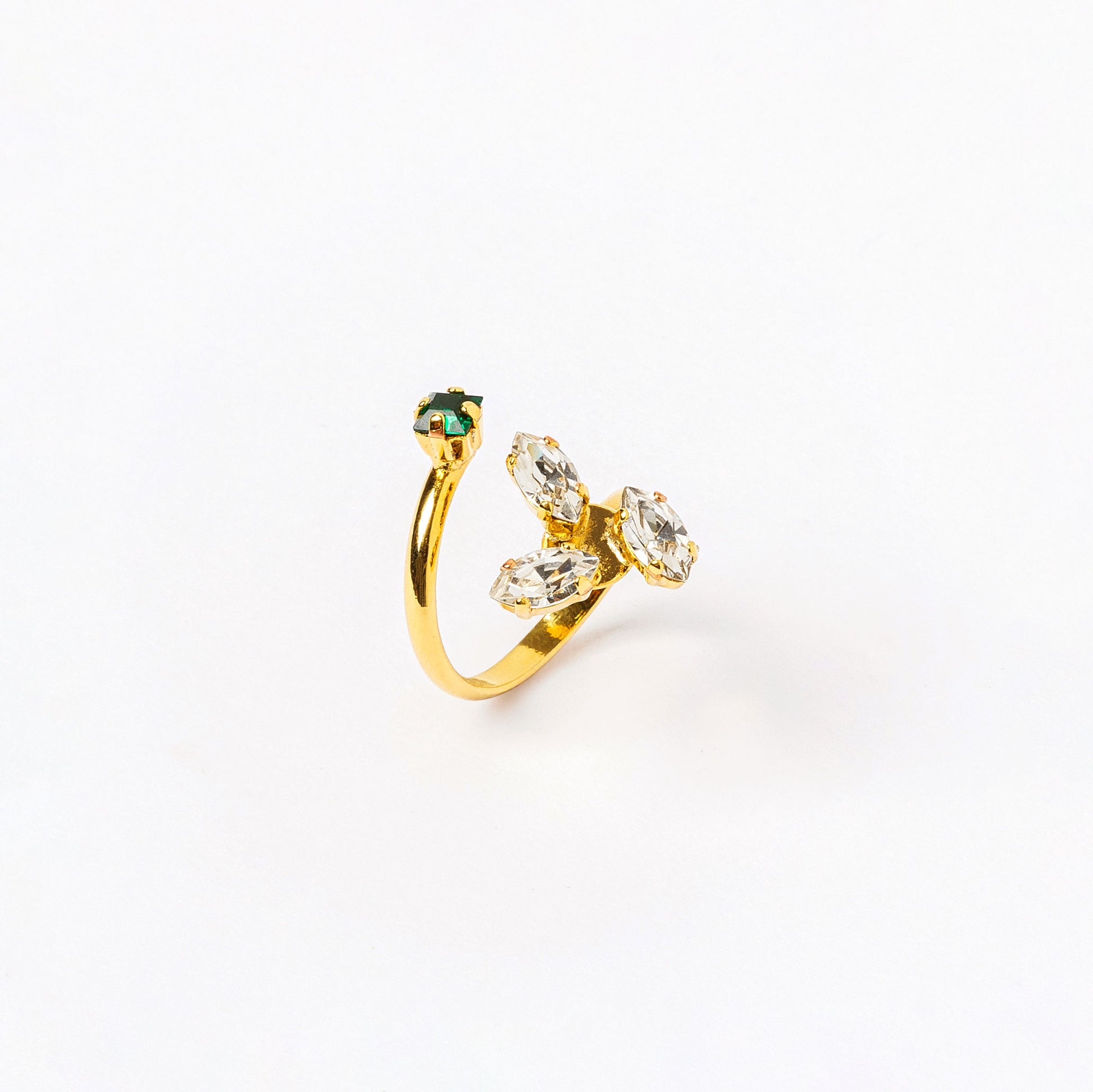 Anello ''Nudo'' bagnato in oro o palladio, con logo Foglia Trilogy con 3 cristalli navetta Swarovski bianchi e 1 cristallo quadrato taglio carré Swarovski verde smeraldo.
