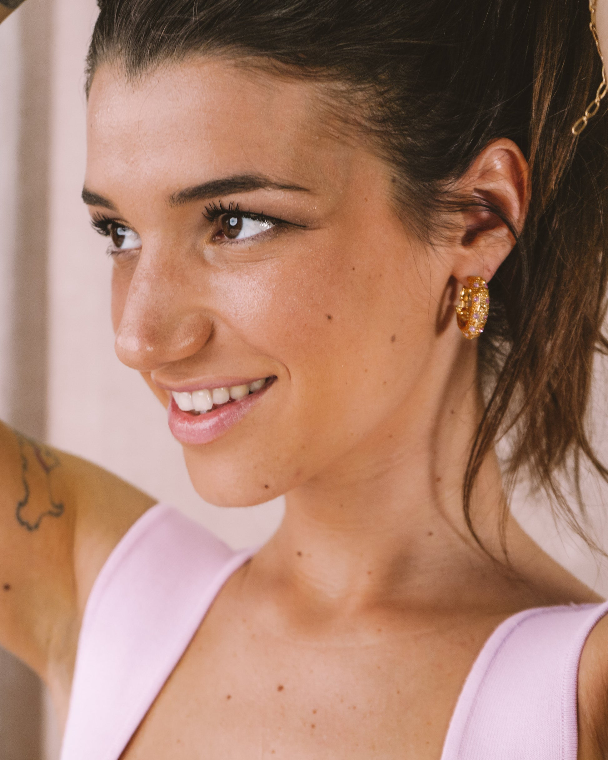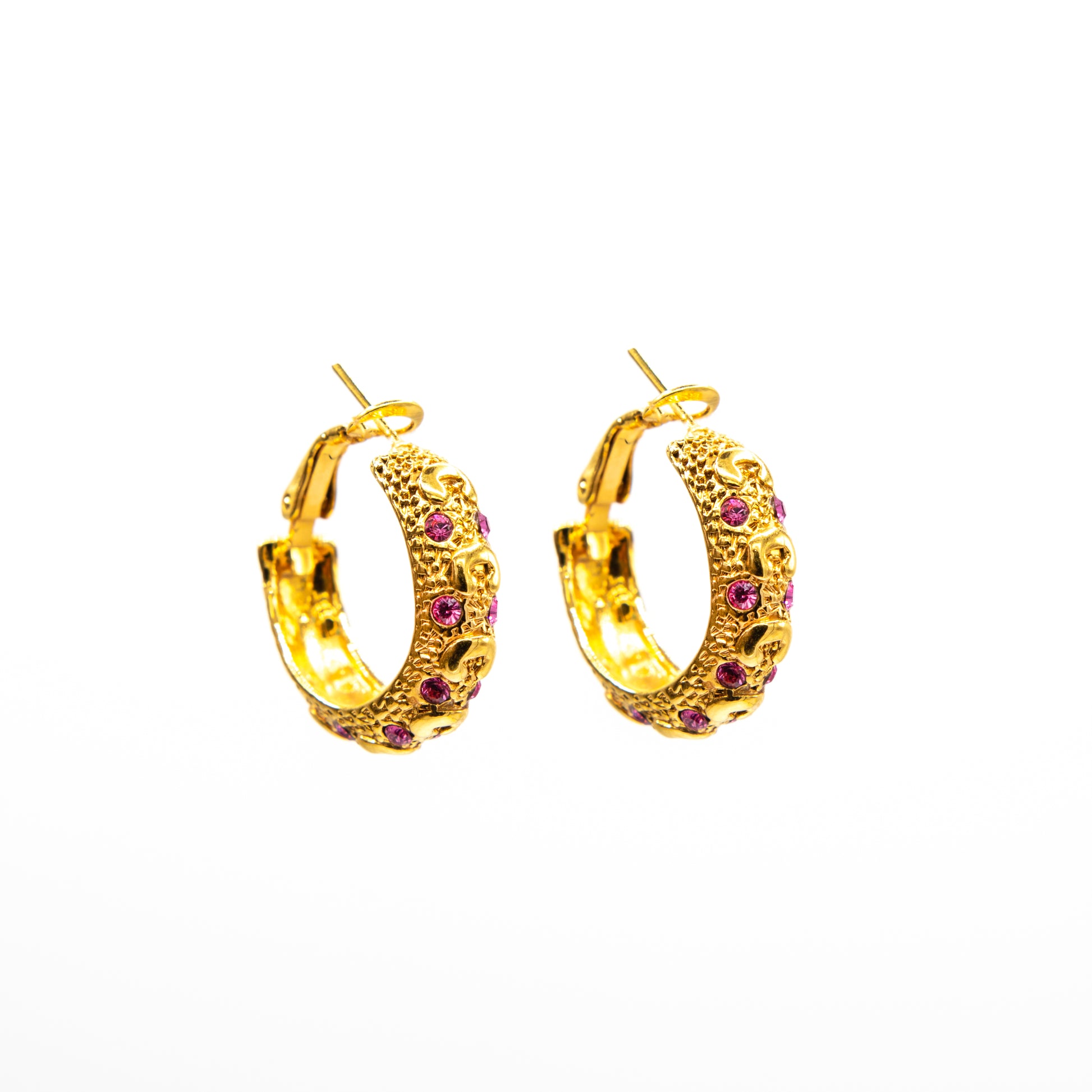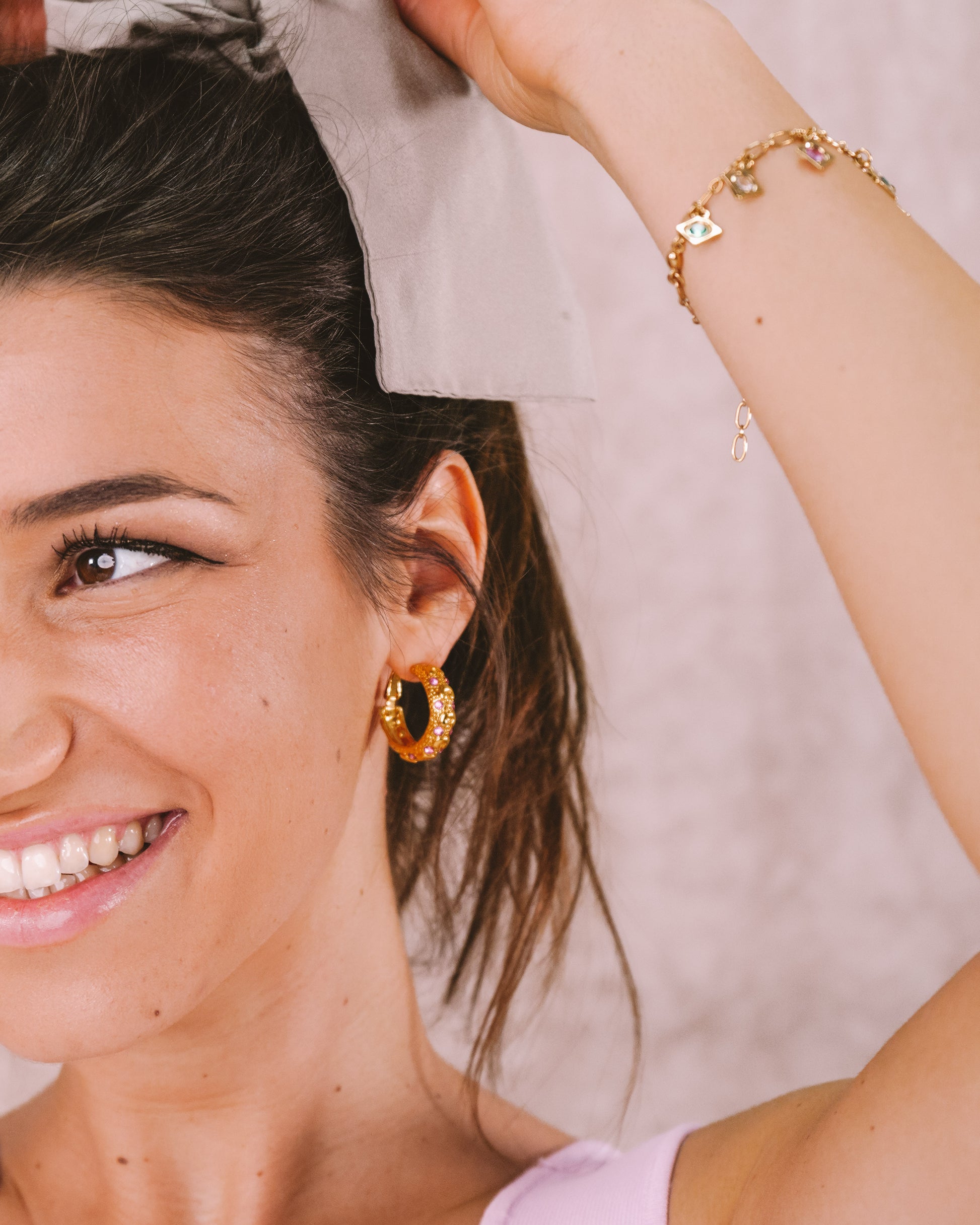 Orecchini a cerchio con cristalli Swarovski disponibili in 3 varianti colore: giallo, rosa, blu.