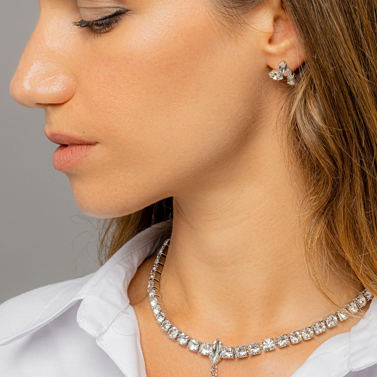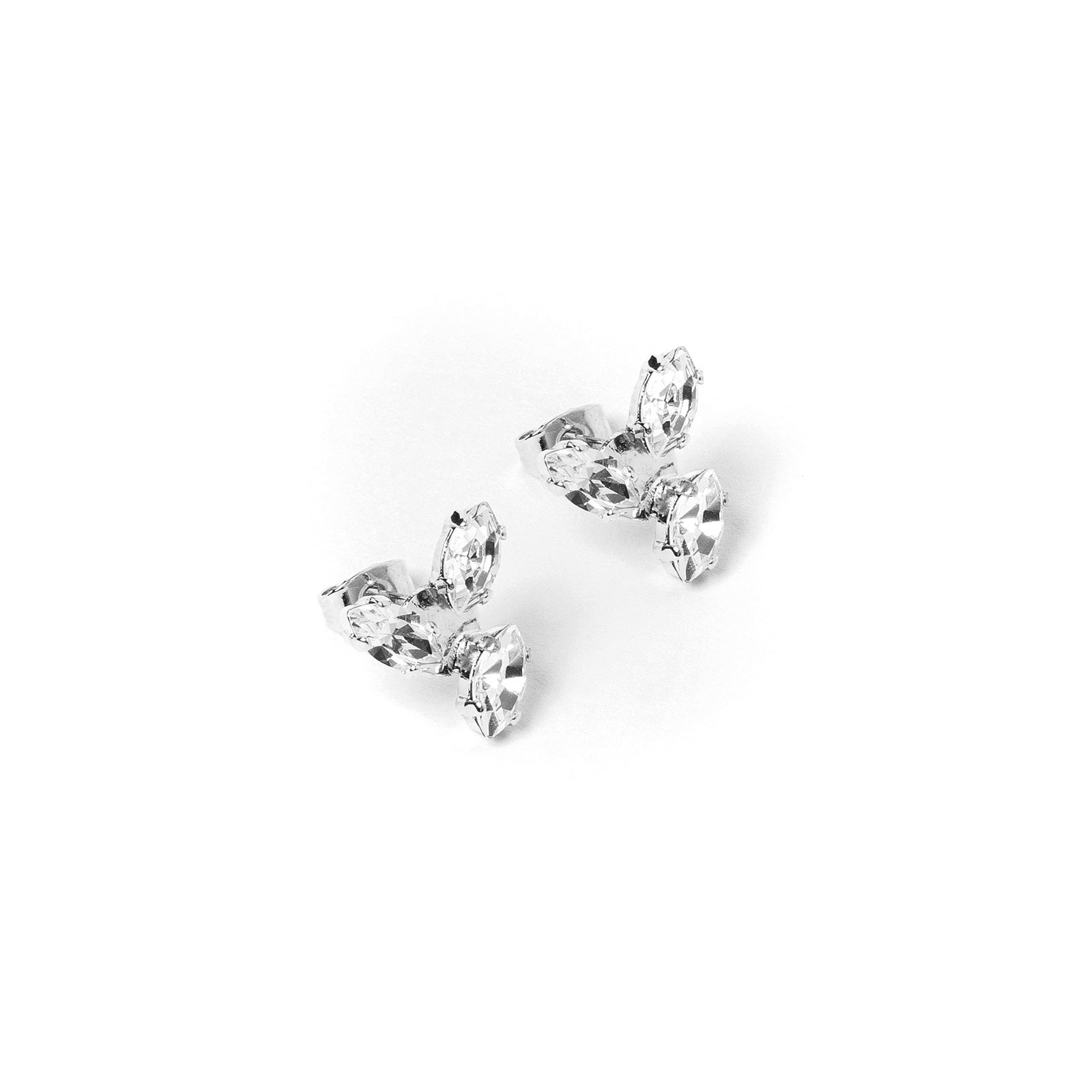 Orecchini a lobo ''Nudo'' bagnato in oro o palladio, con logo Foglia Trilogy con 3 cristalli navetta Swarovski bianchi.
