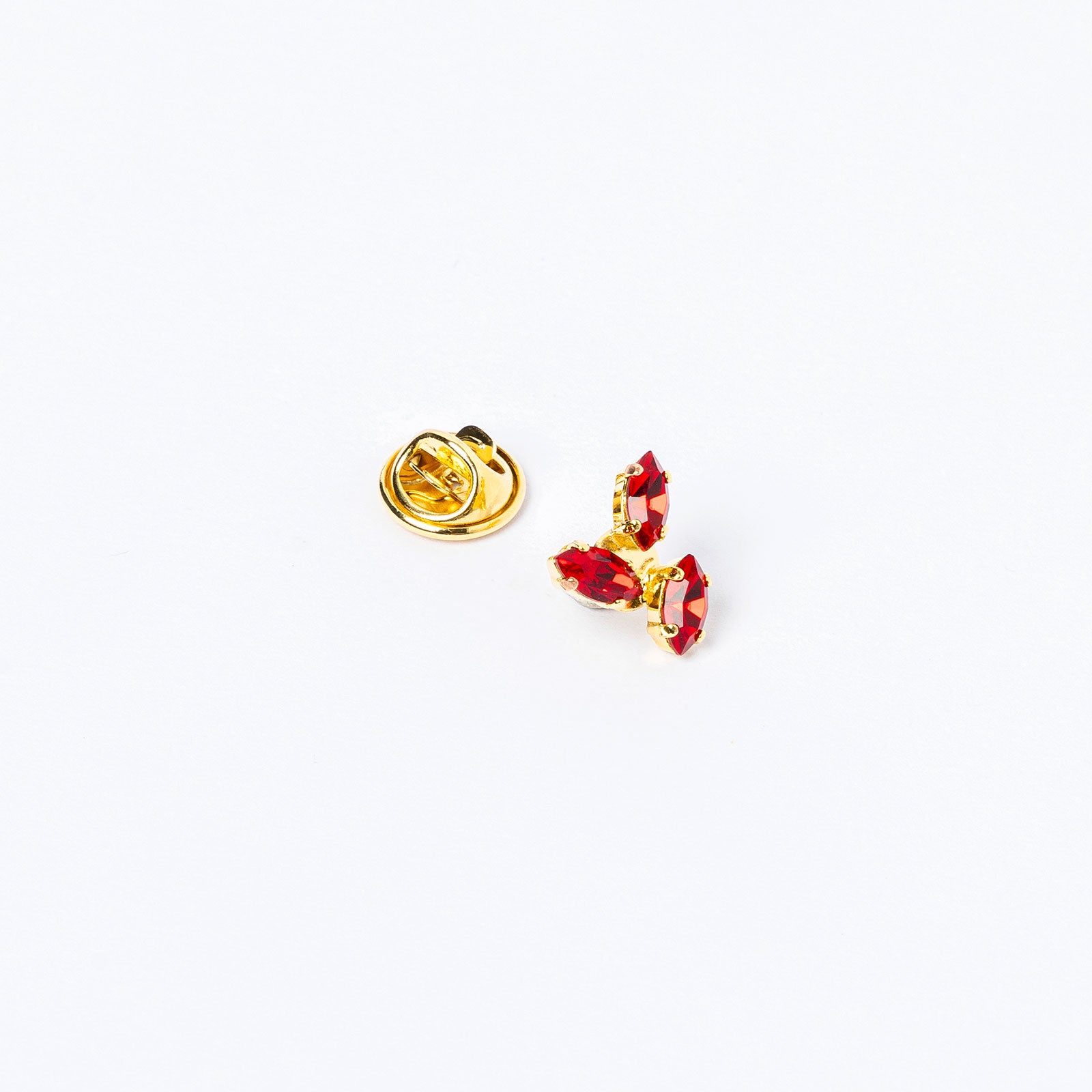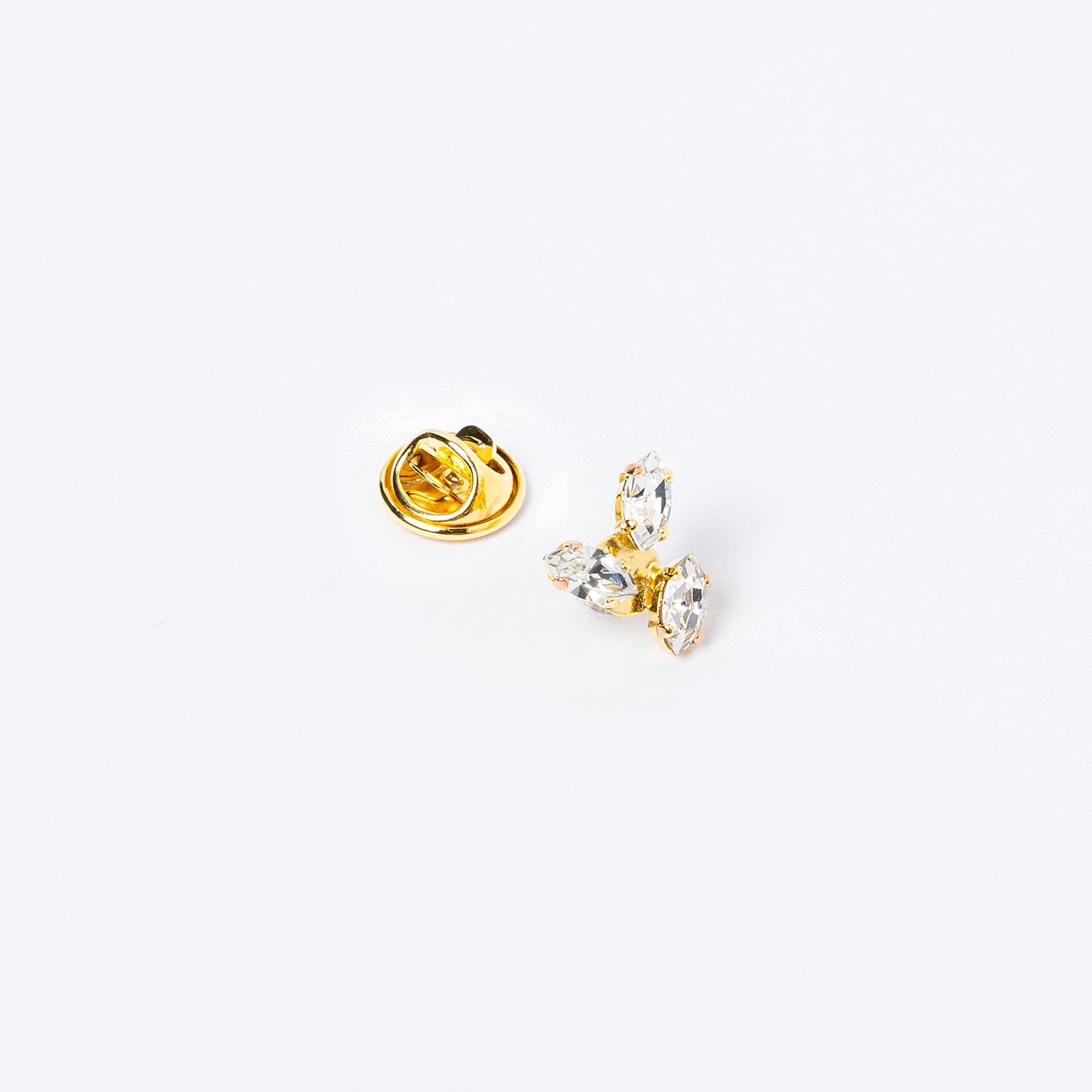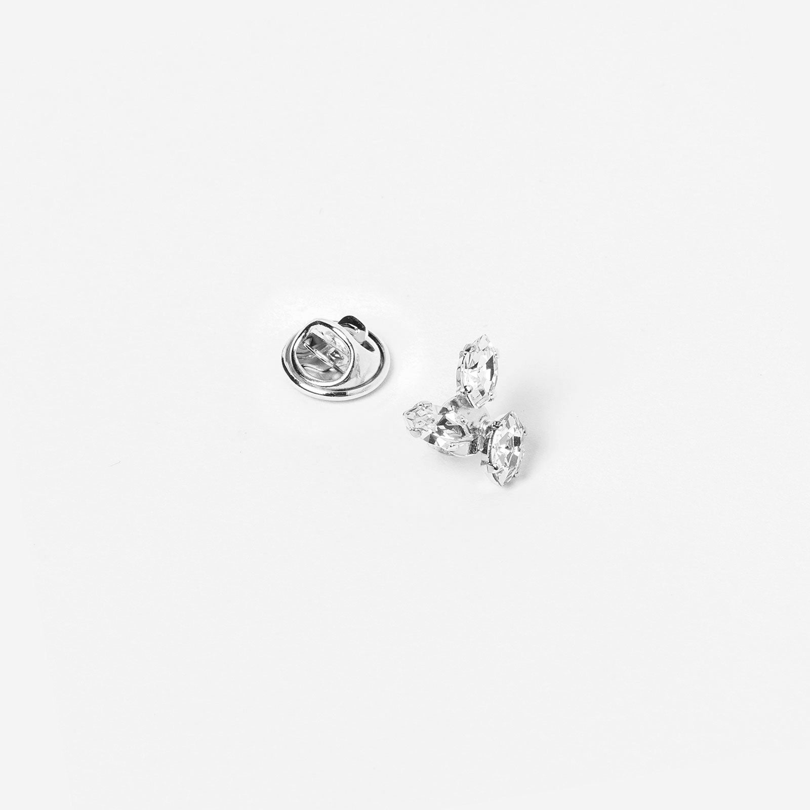 Spilla ''Nudo'' bagnato in oro o palladio, con logo Foglia Trilogy con 3 cristalli navetta Swarovski bianchi.